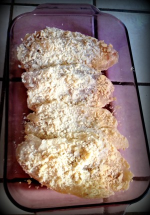 Take one tilapia fillet and dip completely into the egg white. Then immediately dip the fillet into the dry mixture, covering the whole piece in the “flour” mix. Repeat for the other fillets, and place into a sprayed baking dish OR cookie sheet.
