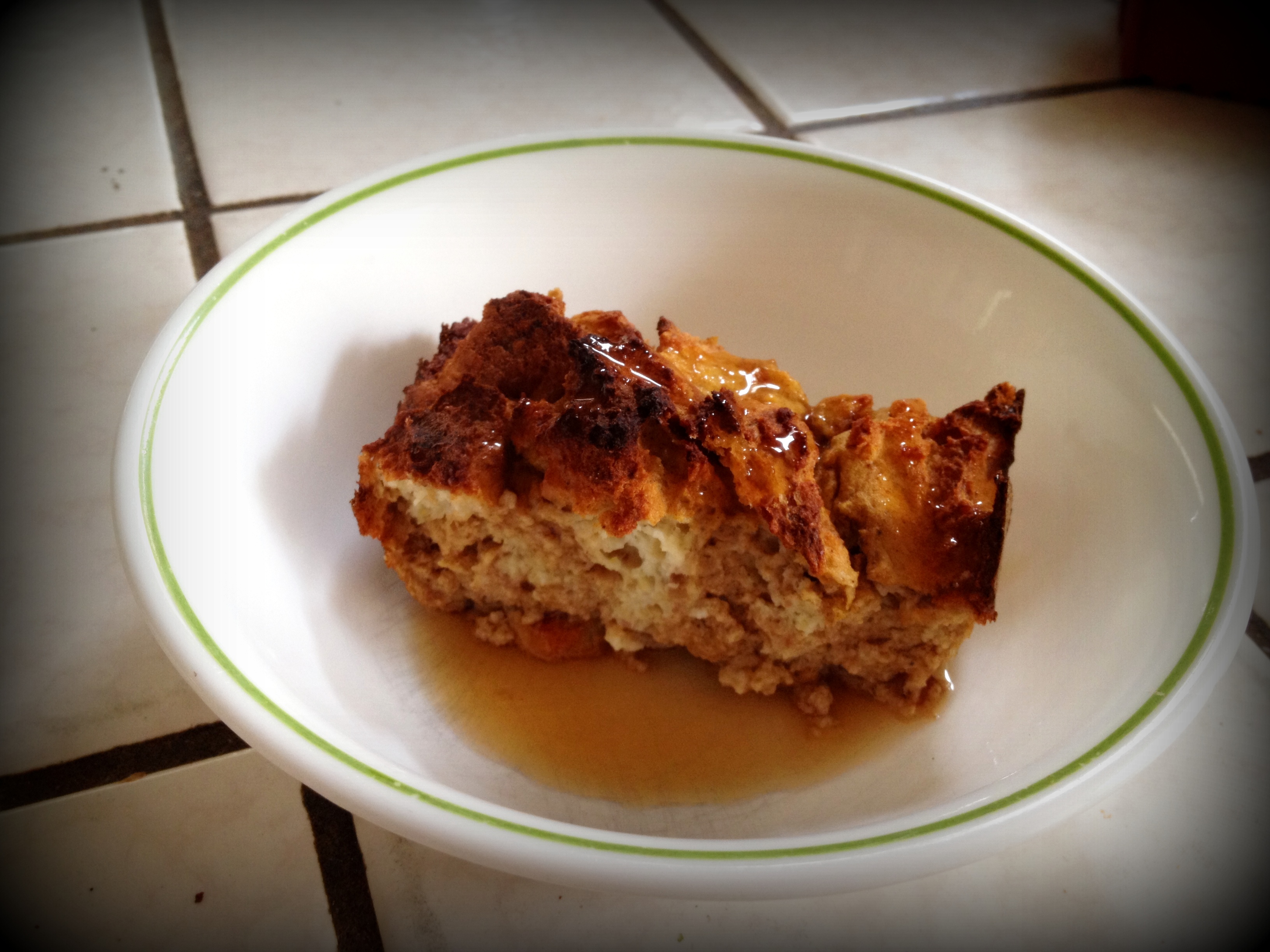 Take your bread slices and break them apart into bite size pieces. Layer into an oiled baking dish or loaf pan (you can use any size…we have used a 11 x 7 Pyrex, and also a silicone loaf pan). Mix together your wet ingredients and spices (eggs, milk, etc) and pour over the bread pieces.
