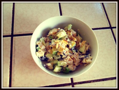 IMG_2753This is a great and easy salad-perfect to make in a large batch and have several servings! It is convenient to throw in your cooler and eat it on the go. Using nonfat plain greek yogurt instead of mayo significantly lowers the fat content while adding protein!