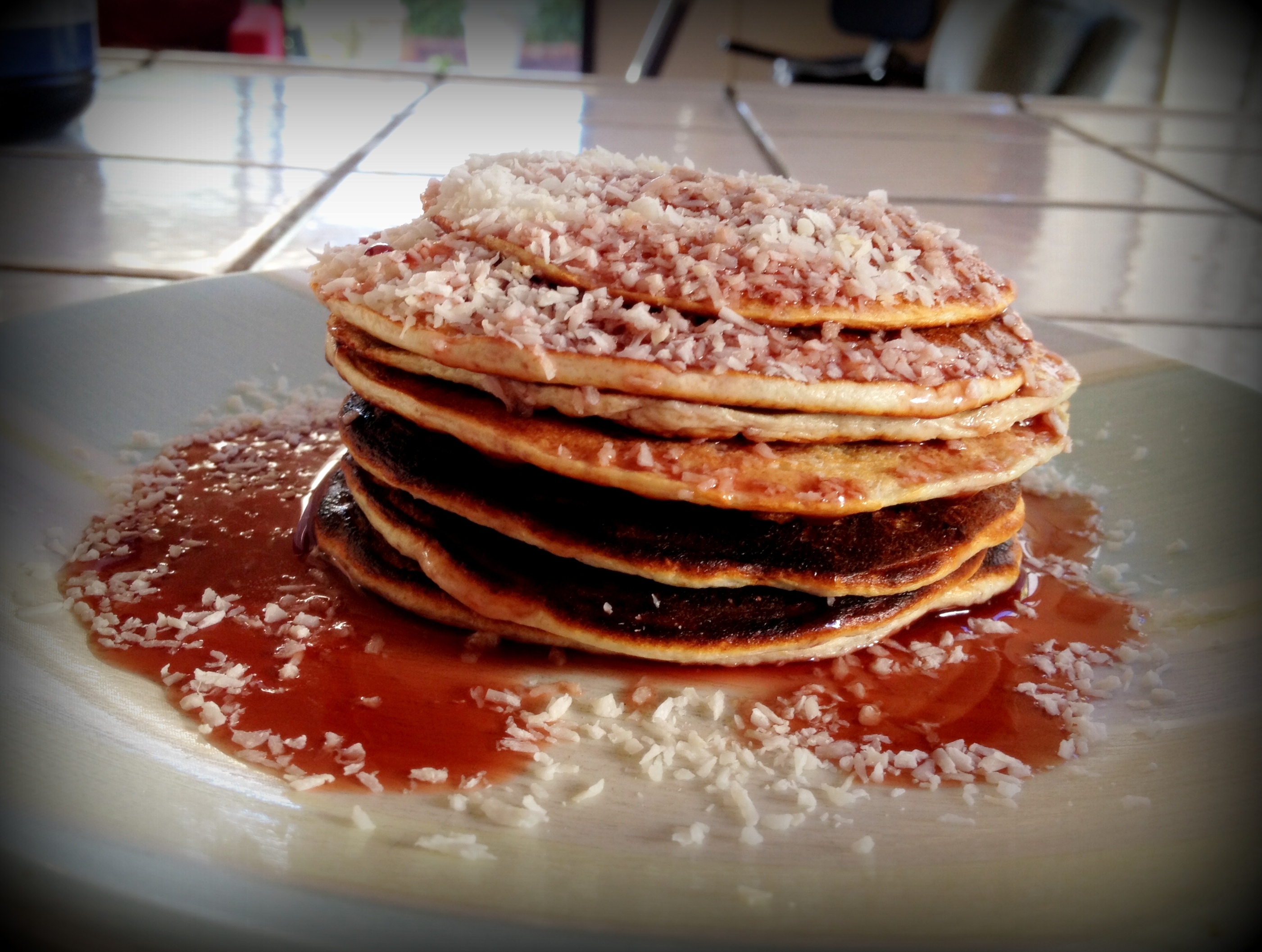 Blend wet ingredients first, then add oats, coconut flour and coconut extract. Cook on the griddle like normal pancakes. My batch made 7 pancakes…!!!
