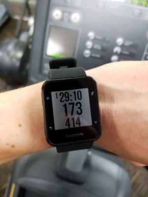 My Garmin Forerunner 35 displaying my HR during one of my HIIT sprints