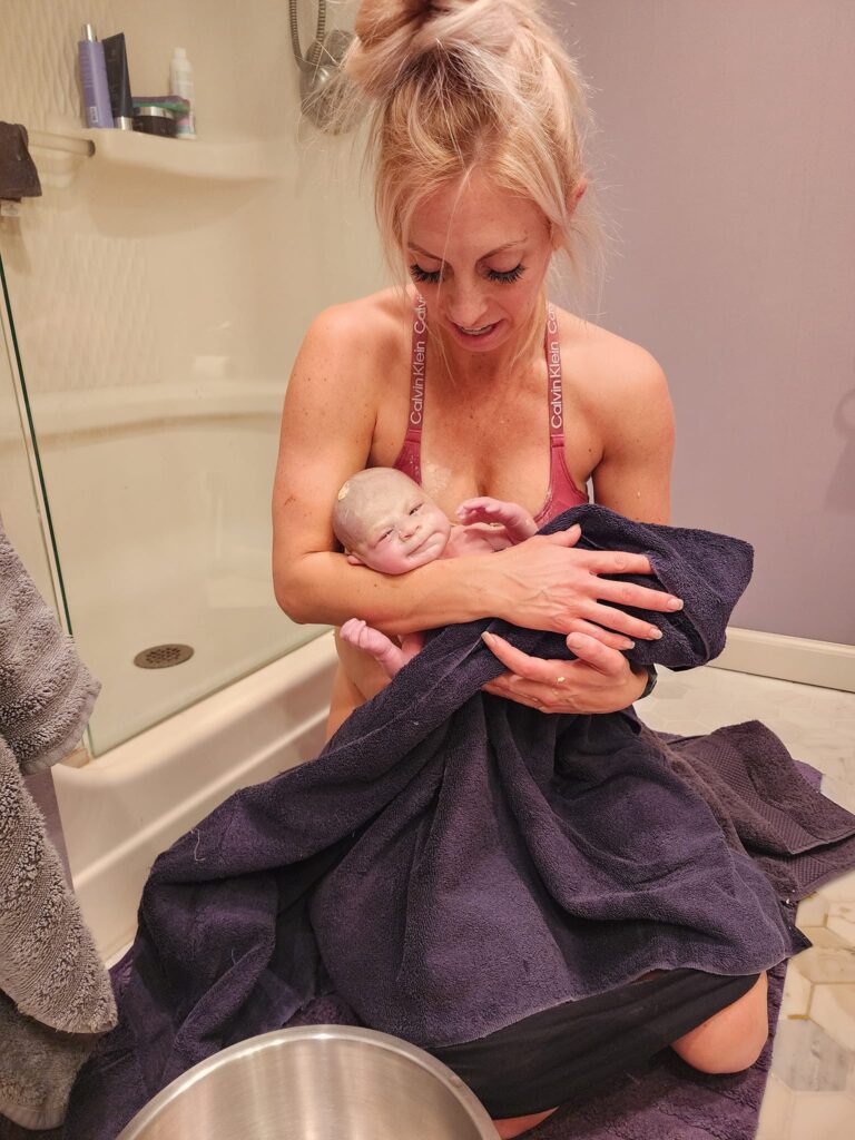 Sarah helped me there and Brian gave me some space (thanks babe haha). We barely get there & I’m having another contraction sitting on the toilet. I got up and said, “I think he’s like RIGHT there, he’s so low!” I’m starting to get a bit nervous and Sarah said she would check. Brian had heard me and had come in at this point. I remember her saying, in her always steady calm voice, “Yes you’re about to crown”. I barely opened my eyes to meet Brian’s and we both had the look of “Holy Moly” on our faces!