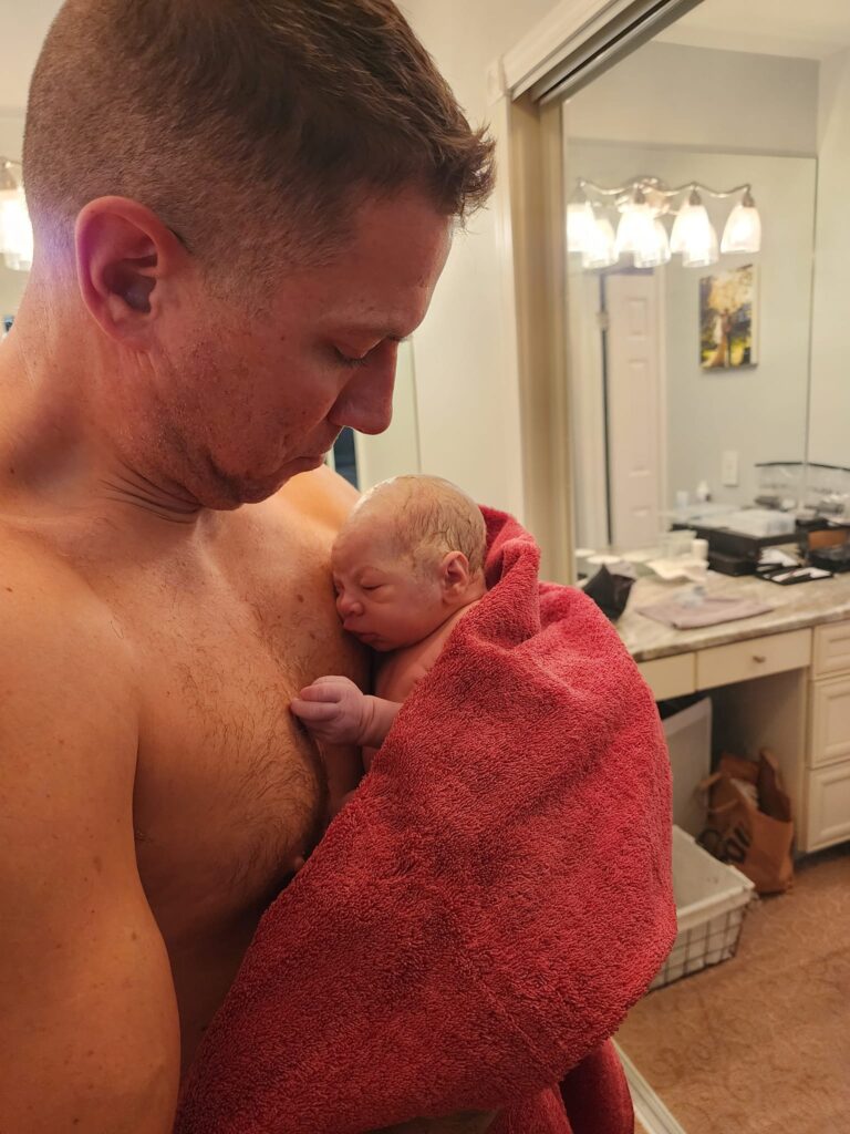 I sat there for about 10 min until Colleen arrived. I was going to wait until the cord turned white, so there wasn’t anything to do except hold him! She started checking him & me, and everything was just perfect. Sarah cut the cord this time, and I showered while Brian got skin to skin & held Jordan for the first time.
