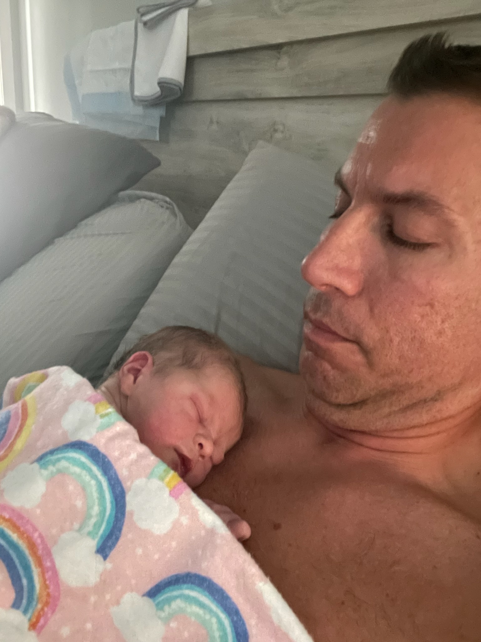 Immediately after, we wrapped her in a towel and had immediate skin to skin together. Once the cord stopped pulsing, Brian was able to clamp and cut it. From there I handed Natalie to him and stood up to deliver the placenta. I found it amazing that during labor I could barely get up on my own, after 10 minutes after delivery, I got up from the floor by myself, standing and half squatting without any assistance, fatigue or pain. It was wild what the body can do!