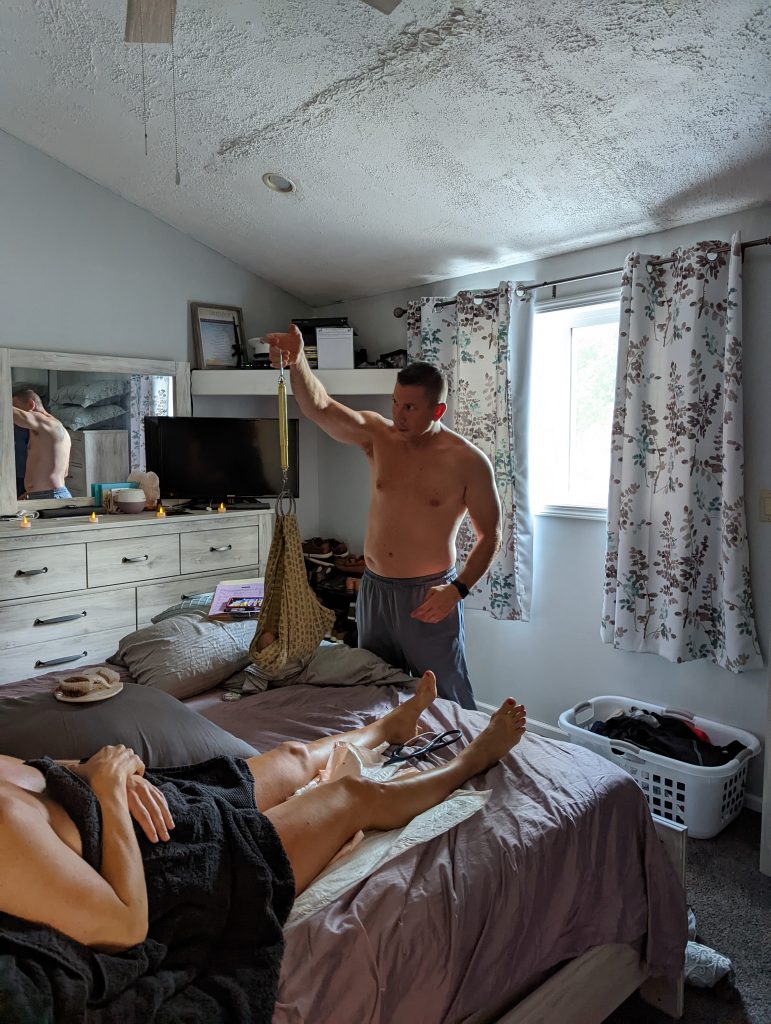 After the water broke, things DID start to progress! Contractions were now stronger and happening every 4-6 minutes. I never described the contractions as pain, but just intense pressure. It was always low in my pelvis and then was radiating into my hips. I spent a lot of contractions kneeling, so my thighs did get fatigued as well. I could tell about 15 seconds before it was happening, then during a contraction I focused on relaxing my breathing, using Brian or Sarah to grip their hand, and Sarah would read/say affirmations to me such as “Your body knows what to do, you are strong and capable, your getting closer to meet your baby”. She has such a soothing calm voice; I was repeating those in my head but it really helped to have someone verbally say them as well. Both Brian & Sarah would give me encouragement after every contraction. Some I was able to carry on a conversation in between, some I just rested and had silence.