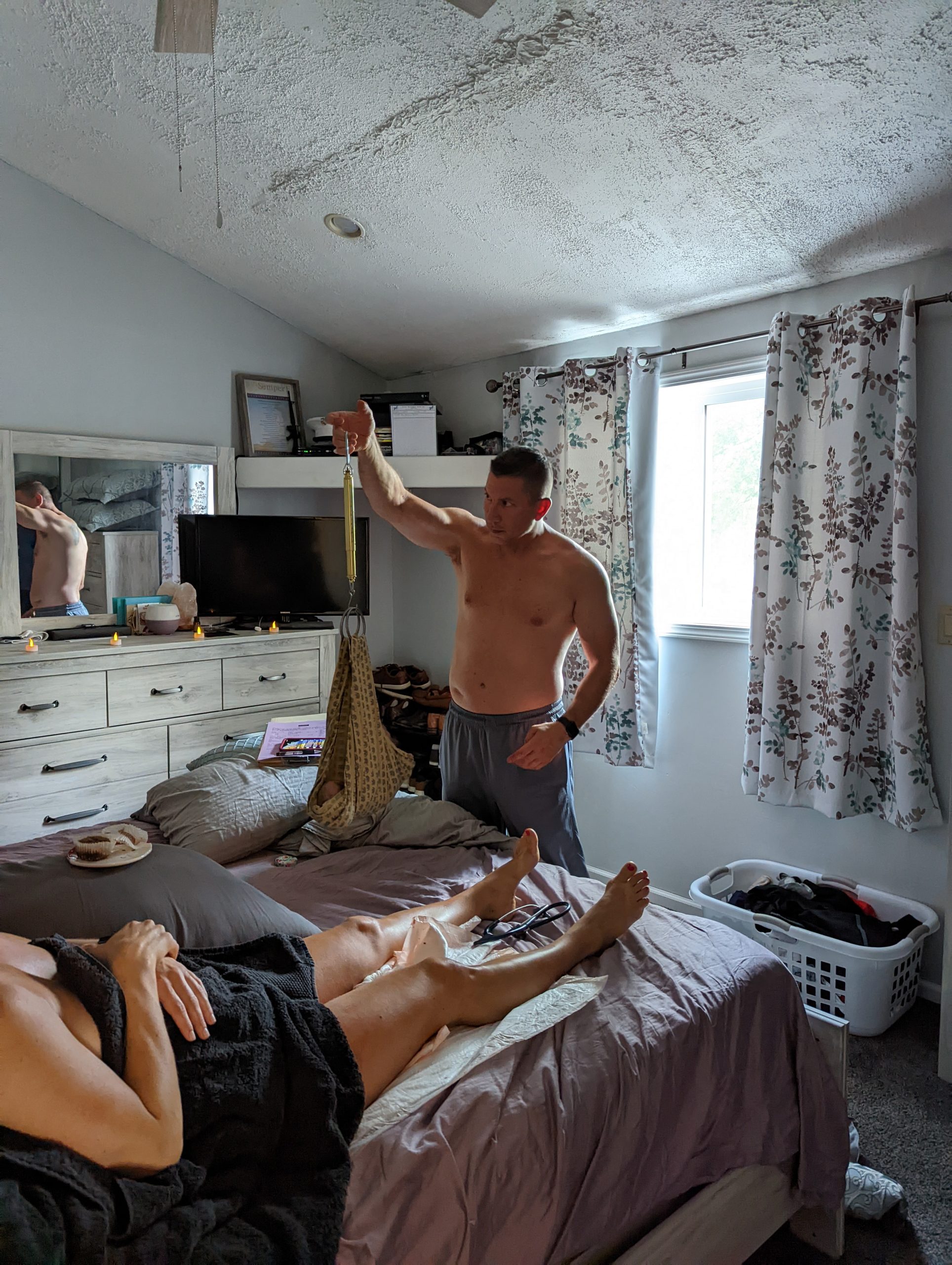 Sarah had set up tea light flameless candles and I turned on background Christian labor worship music (I found a playlist on Spotify called that!) We had our stability ball, a peanut ball and a giant U shaped inflatable “seat” as well. From 11pm for the next few hours, we tried different positions: side lying on the bed, kneeling on the bed, kneeling on the floor with my arms on the bed or stability ball. I also took a hot shower and occasionally paced around upstairs and did light side to side rocking/stretching. Sarah was so great in recommending different things to try. Brian ended up taking a short nap downstairs (it was 1am and he had been up since 5:30am!) It had been several hours that my contractions were about 7-10 minutes apart, but they weren’t consistent and I felt like I my progress was slow. Mentally I was starting to doubt; “Is this a normal pace, am I doing ok, what do I need to do to progress?” I noticed heat (shower) and lying on my side, while made me feel more relaxed, they actually slowed the contractions. I thought, “No no, we need to speed it up, that is the opposite effect LOL!”