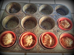 Combine all ingredients in a bowl until thoroughly mixed. It should have a dough-like consistency (in between a pancake batter and a cookie dough). Pour into your silicone baking liners, or well sprayed muffin tins.