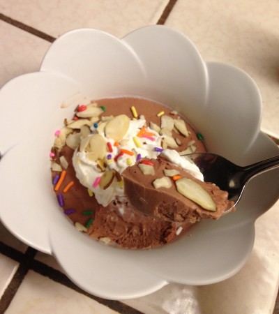 Step 3: Transfer to a bowl/mug/anything you want. At this point it will be a “pudding” consistency. If you have NO patience or prefer pudding more than ice cream, feel free to indulge immediately!! If not, proceed to Step 4.