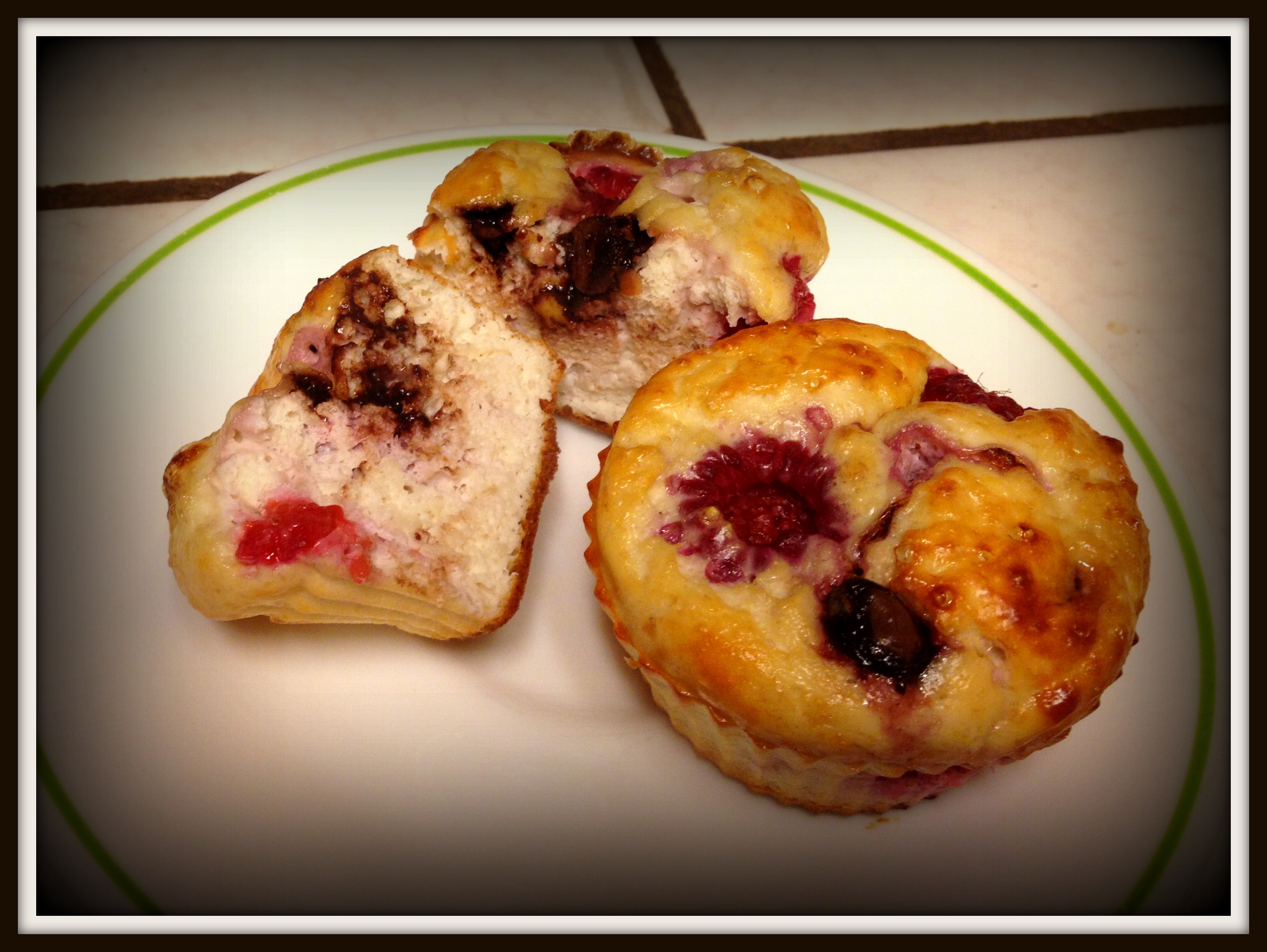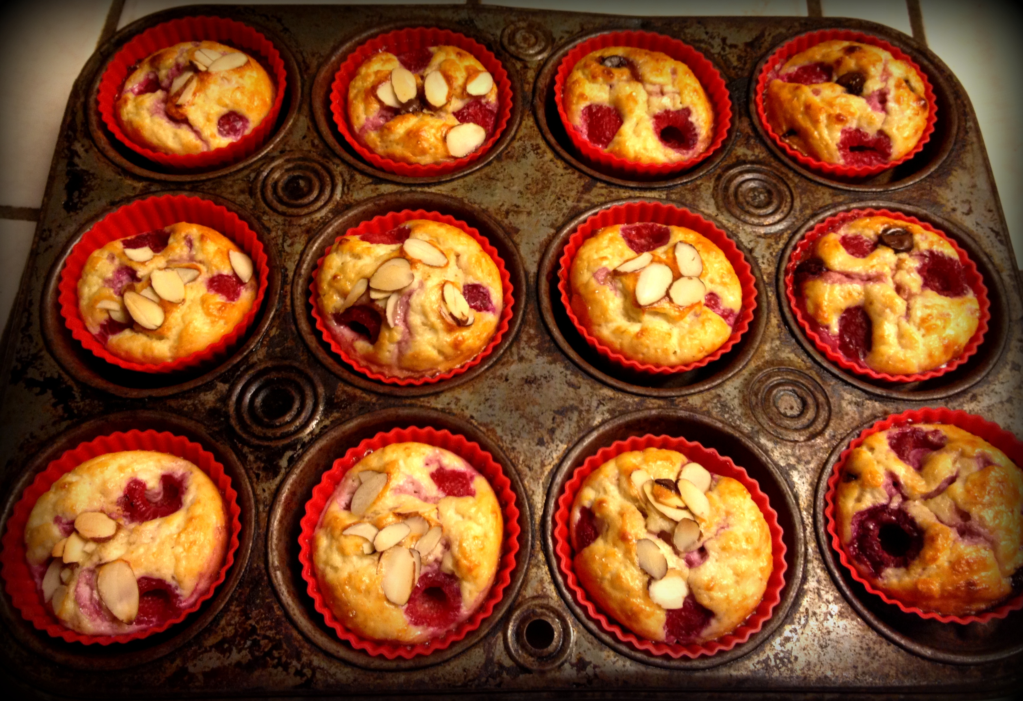 Combine all ingredients together except raspberries, chocolate chips, and sliced almonds. Mix thoroughly until batter is smooth. It should be fairly light in consistency, not too doughy. Pour batter into silicone muffin liners or very well sprayed foil muffin liners. Drop in raspberries (I chose 3 for each muffin) and add chocolate chips or almonds if you wish.