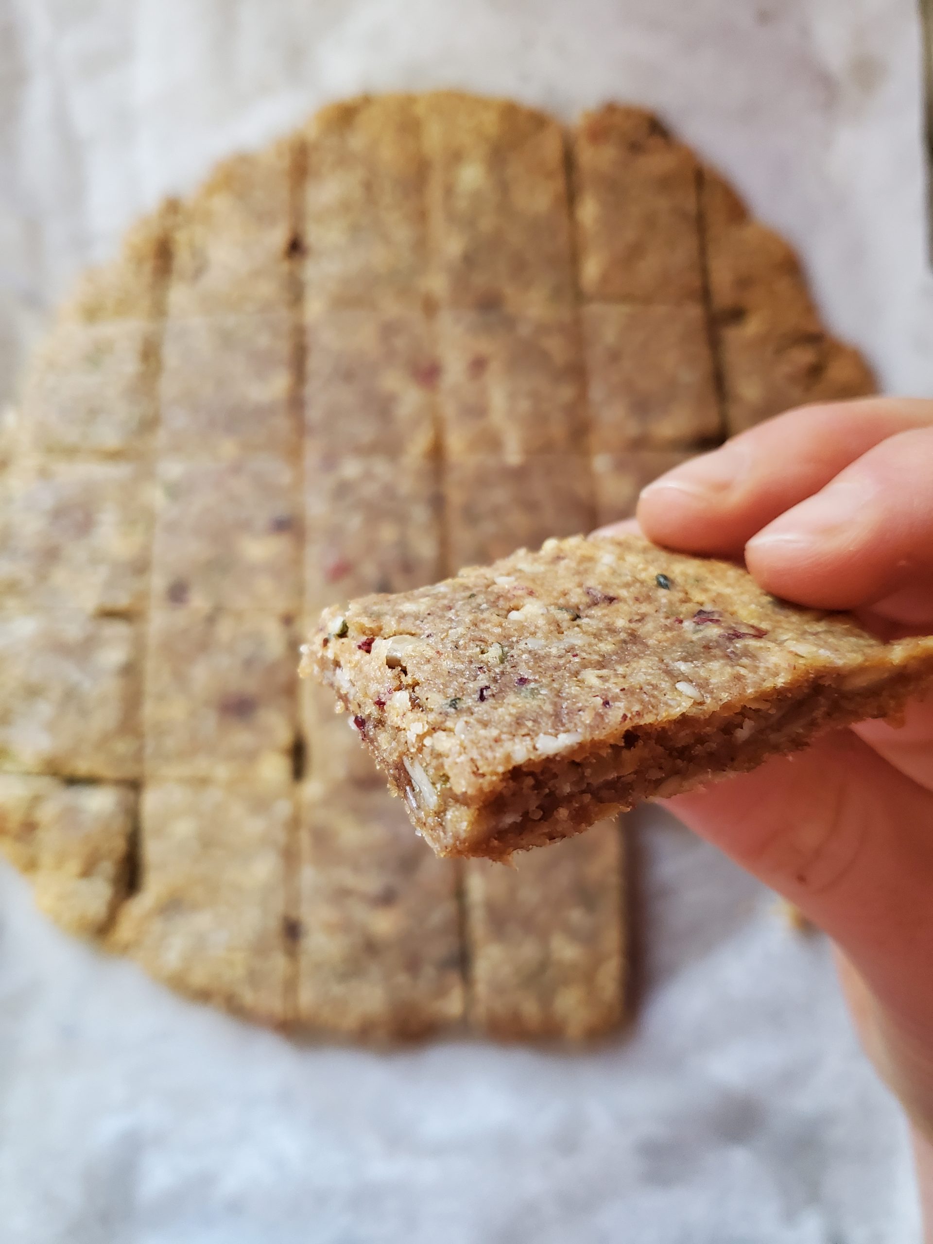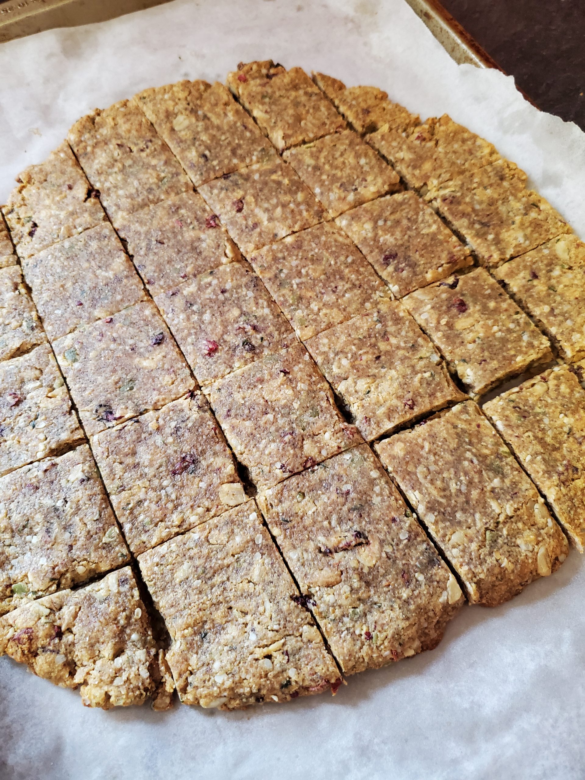 Once it’s spread out evenly to your desired size, bake at 350F for 10 minutes. Let them cool before cutting into approx 16 squares.