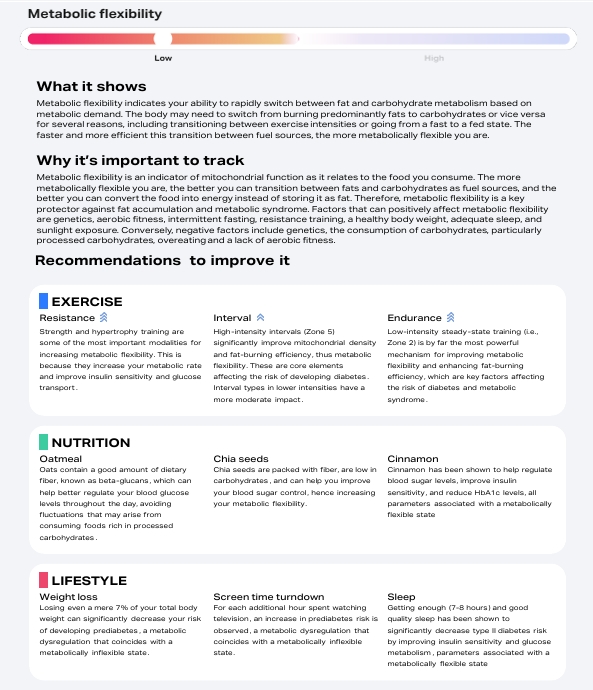 During a simple 10–12 minute test, you’ll lay or sit comfortably, and breathe into a mask while your body’s oxygen consumption (VO₂) and carbon dioxide production (VCO₂) are measured. From there, you’ll receive a clear, personalized report outlining your metabolic rate, ideal training zones, fuel utilization (fat vs. carbs), and nutrition recommendations tailored specifically to your unique physiology! Below is a sample page of one of the markers it measures.