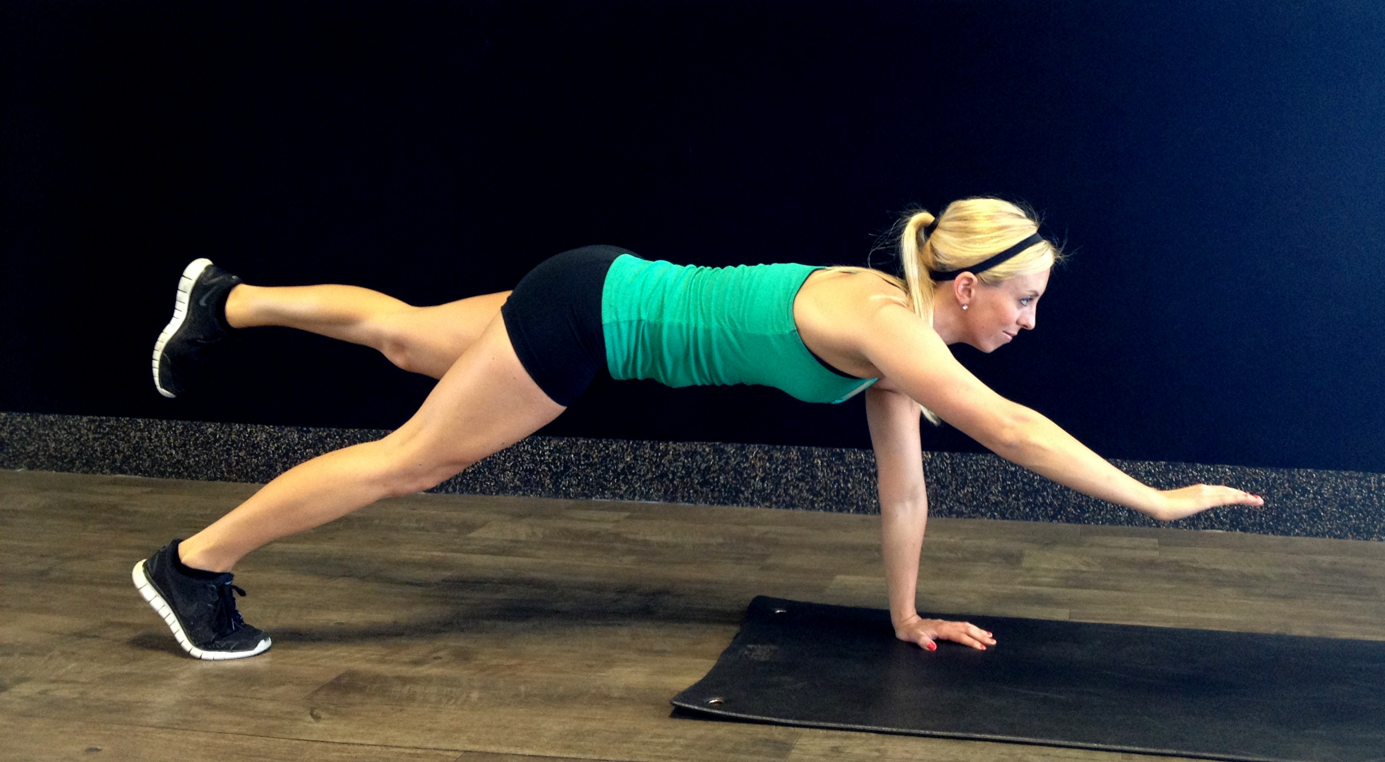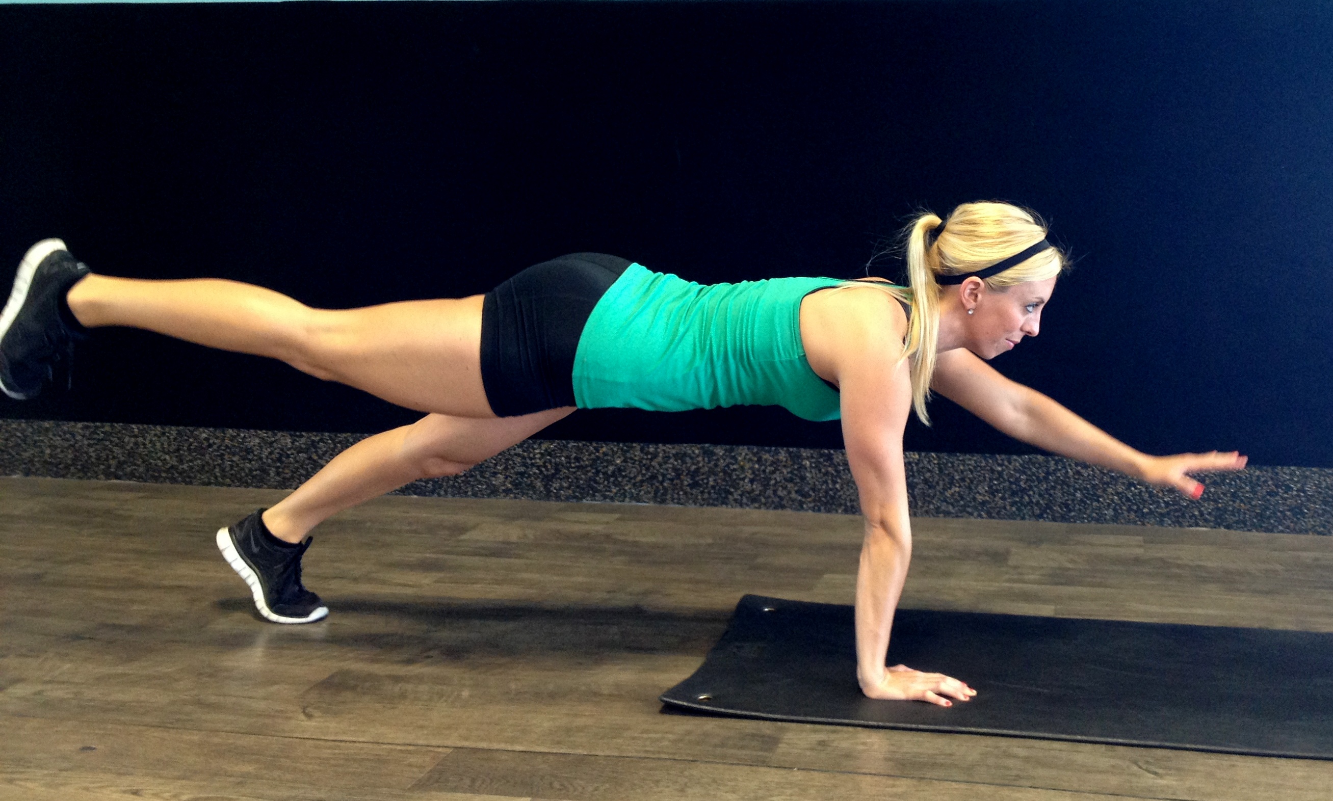 Get into a “high plank” position, stabilizing with straight arms, legs extended and your body is in straight line. Focus on keeping your hands under your chest and not dropping/raising your hips. Contract your core, and slowly extend opposite arm and leg until parallel to the ground. Be careful to not rotate your hips to either side and hold for a count before slowly switching sides.