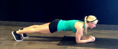 The basic plank starts with your body straight and resting your weight on your forearms. While keeping your elbows under your shoulders, slowly lift your hips off the floor and balance on your toes and forearms. Keep your feet shoulder width apart and your neck in a neutral position. It is very important to keep your body in a straight line; avoid letting your hips raise up or sink too low. Be consciously engaging your core muscles and drawing in your abs towards your spine.