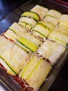 Mix ricotta filling in a small bowl. When zucchini is ready, layer 4 strips to make a T shape. Add about 2 TB filling to center.
